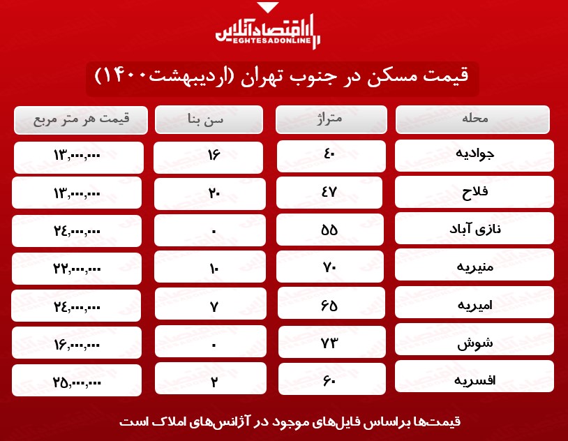 رویداد۲۴  لیست خرید و فروش آپارتمان در جنوب تهران  به  شرح زیر است. توجه کنید که قیمت‌ها بر حسب مترمربع به تومان بوده و تقریبی است، چراکه قیمت مسکن در تهران با توجه به نوع ساختمان، امکانات، خیابان و یا نظر مالک تغییر می‌کند.