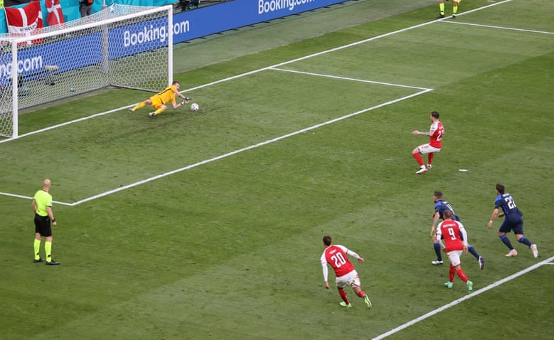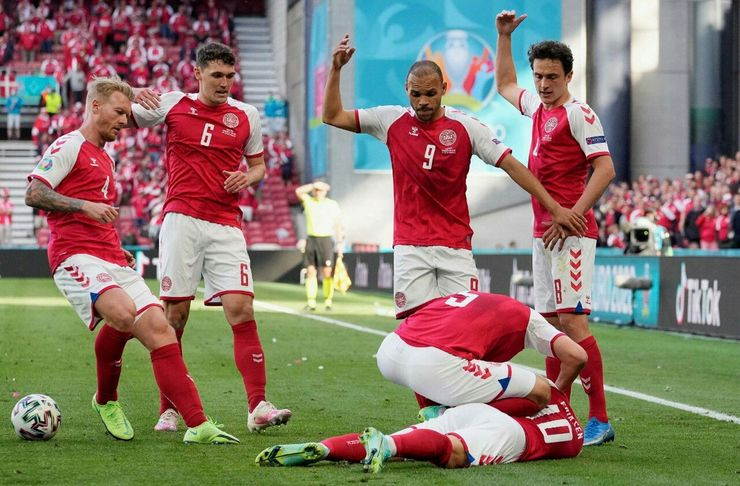 رویداد۲۴ نیمه نخست تیم برتر دانمارک بود، اما به گل نرسید و دقایق پایانی این نیمه هم کریستین اریکسن بیهوش شد تا با حدود ۲ ساعت وقفه این بازی از سر گرفته شود.