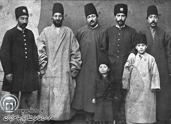 دکتر محمد مصدق (سومین نفر ایستاده از چپ) در کنار پدر و برخی بستگان در دوران کودکی