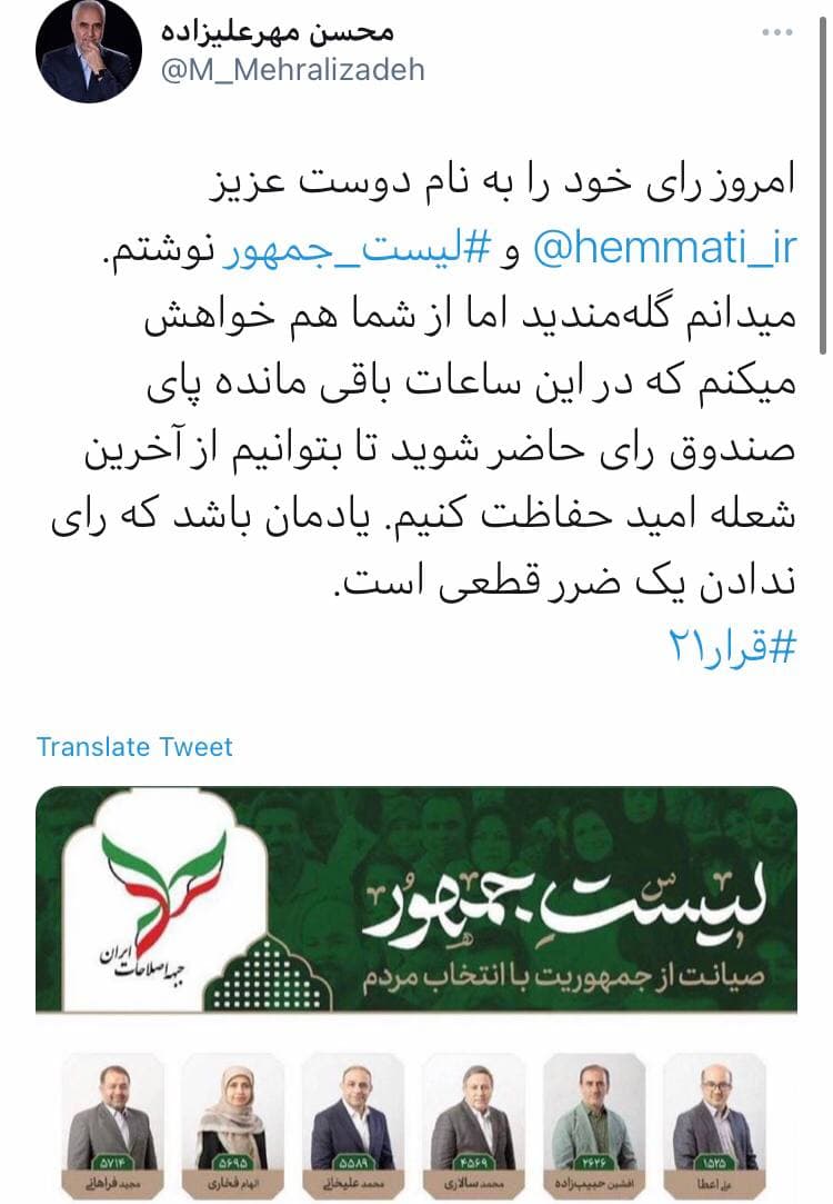 -برخی از رای دهندگان در حسینیه جماران نسبت به اظهارات محسن مهرعلیزاده در مناظرات انتخاباتی نسبت به یکی از نامزدها اعتراض کردند و با شعار مرگ بر ضد ولایت فقیه، وی را تا درب خروجی مشایعت کردند .