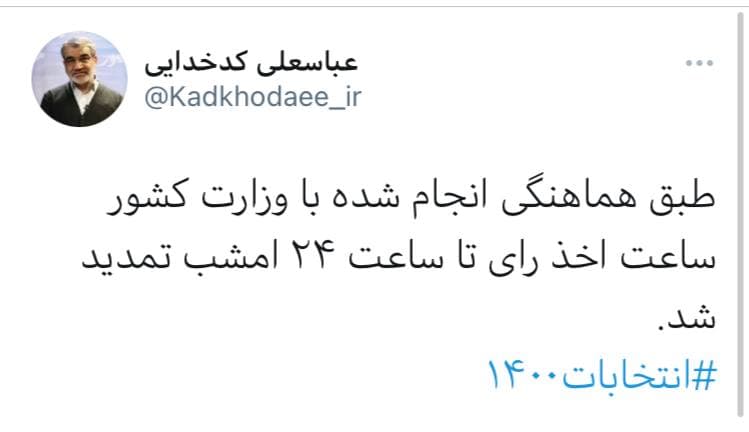 -سخنگوی ستاد انتخابات: زمان رایگیری به پایان رسید و دیگر تمدید نمیشود؛ فقط کسانی که در شعب هستند میتوانند رای بدهند.