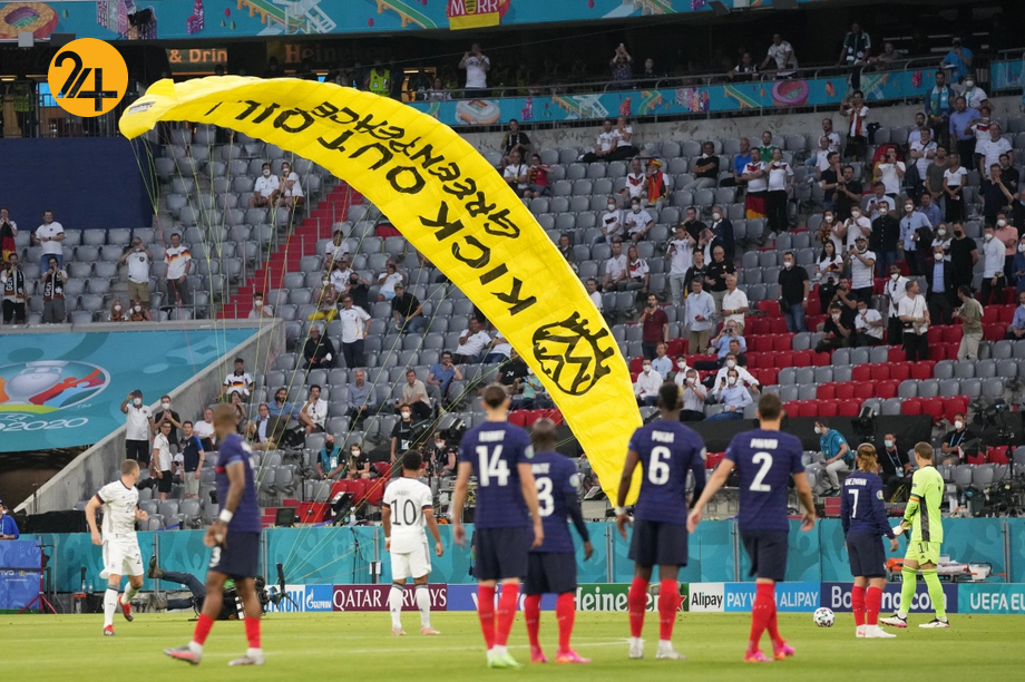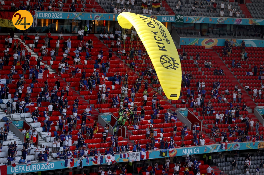 این پاراگلایدرسوار در پی اعتراض به یکی از اسپانسرهای جام ملتهای اروپا یعنی فولکس واگن و آسیبهای این شرکت به محیط زیست دست به این اقدام زده بود.
