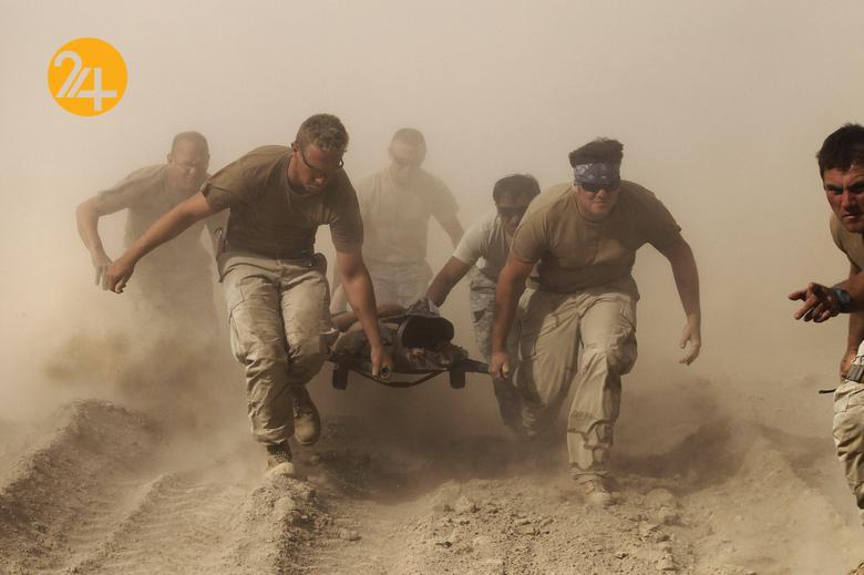 اکتبر سال 2010 سربازان نیروی دریایی آمریکا در حال انتقال یکی از همراهان‌شان به هلیکوپتر او در یک انفجار در میدان جنگ در قندهار زخمی شده است