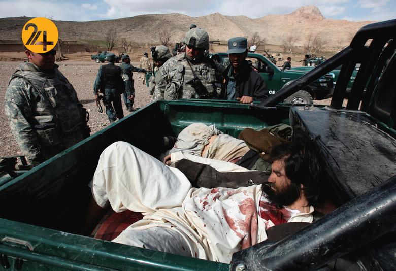 مارس 2008 سربازان ارتش آمریکا و پلیس افغانستان در حال تماشای اجساد نیروهای طالبان پس از 40 دقیقه جنگ نفس‌گیر در استان زابل