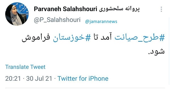 رویداد۲۴ پروانه سلحشوری، نماینده سابق و اصلاح طلب مجلس در توئیتی ادعا کرد طرح صیانت در فضای مجازی برای فراموشی موضوع خوزستان بوده است.