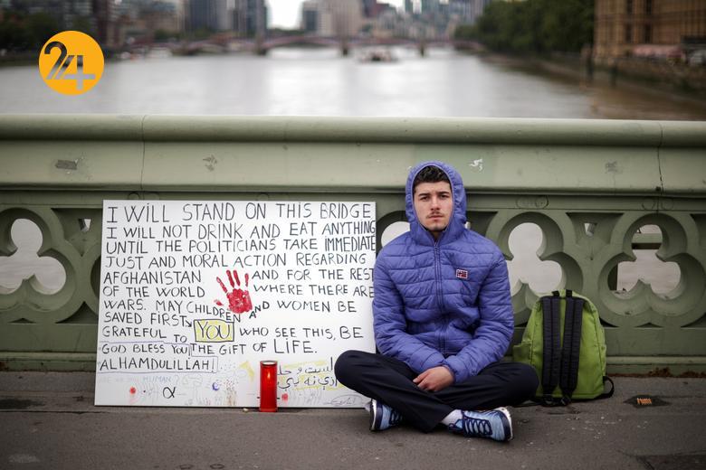 آندری لورنت، ۲۲ ساله، در تجمعات ضد طالبانی د پل وست مینستر او از سیاستمداران می‌خواهد برای حمایت از افغانستان اقدام کنند، لندن، بریتانیا، ۱۷ اوت ۲۰۲۱ میلادی