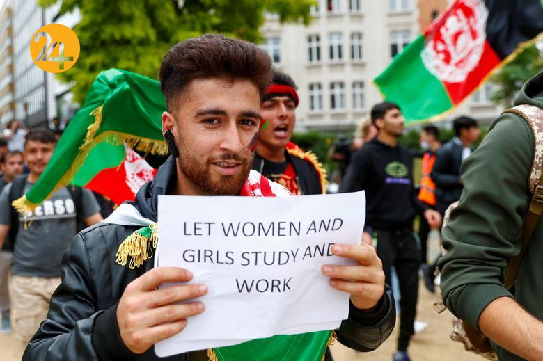 تظاهرات ضد طالبان در بروکسل، بلژیک، ۱۸ آگوست ۲۰۲۱ _ یک معترض با در دست داشتن پلاکاردی با شعار " به زنان و دختران اجازه تحصیل و کار کردن دهید به خیابان آمده است.