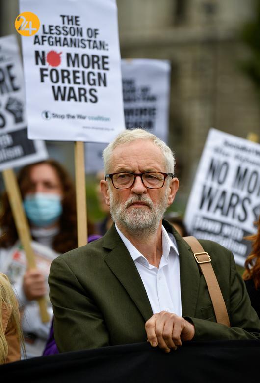 روز 18 آگوست 2021 _ یک معترض افغان در تجمع ضدطالبانی در میدان پارلمان در شمال شرقی کاخ وست‌مینستر در شهر لندن