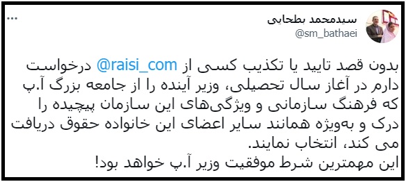 جالبتر آنکه نام سیدمحمد بطحایی نیز در میان حامیان فیاضی دیده میشد که معتقد بود مجلس انقلابی باید به فردی که تجربه هم ندارد، فرصت بدهد و فیاضی را به عنوان وزیر آموزش و پرورش انتخاب کند. کاربران شبکههای اجتماعی اما توییتهای قدیمی خود او را بازنشر کردند که در ابتدای دولت از رئیسی درخواست کرده بود فردی از درون خود وزارت به عنوان وزیر انتخاب شود، زیرا تنها راه موفقیت آموزش و پروش همین است. کاربران در واکنش به حمایت بطحایی از فیاضی نوشتند حداقل به حرف خودت پایبند باش.