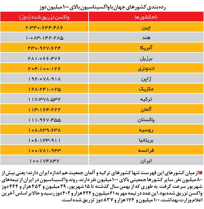 رویداد۲۴ کشورهای چین، هند، آمریکا، برزیل، اندونزی، ژاپن، مکزیک، ترکیه، آلمان، پاکستان، روسیه، بریتانیا ، فرانسه و در نهایت ایران، در این فهرست بالای ۱۰۰ میلیون دوز تزریق قرار دارند. البته با توجه به جمعیت بالا در چین و هند، این کشورها بهترتیب، بالای ۲ میلیارد و بیش از یک میلیارد دوز واکسن تزریق کردهاند. از میان این ۱۴ کشور، تنها ترکیه و آلمان، جمعیتی به اندازه ایران دارند و جمعیت بریتانیا هم تقریبا ۲۰ میلیون کمتر از ایران است.