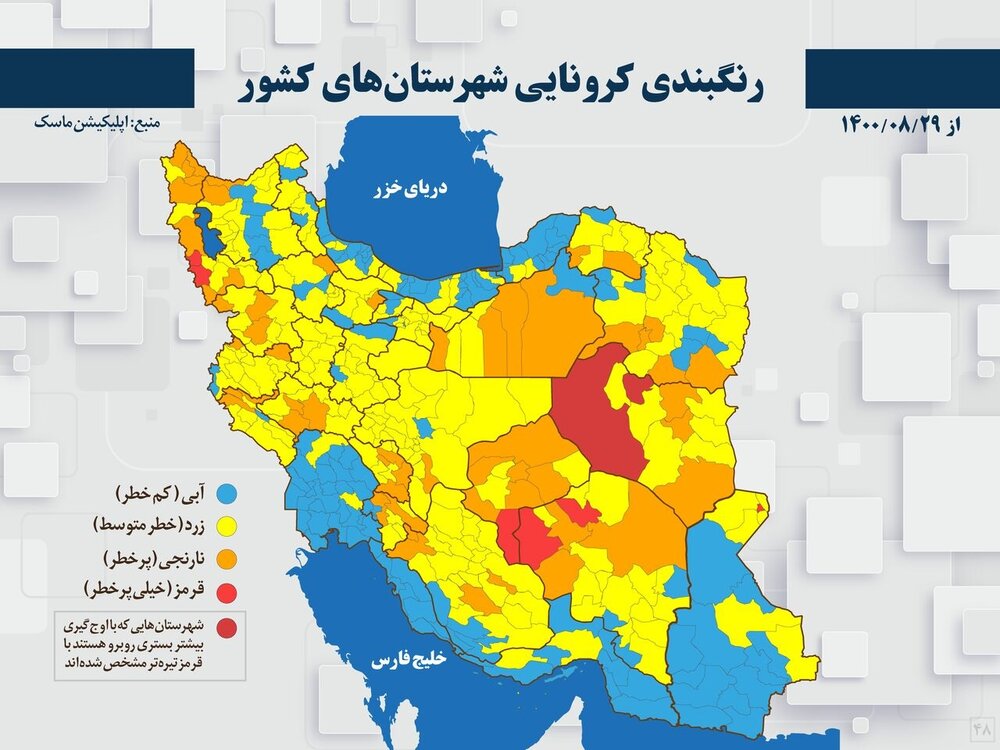 رویداد۲۴  براساس آخرین تغییرات در نقشه رنگبندی شهرستان‌های کشور که از ۲۹ آبان اعمال می‌شود با کاهش شهرستان‌های قرمز کرونایی هم‌زمان با خروج اکثر نقاط کشور از خیز پنجم کرونا؛ ۸ شهرستان در وضعیت قرمز، ۵۸ شهرستان نارنجی و ۲۳۶ شهرستان زرد هستند. تعداد شهرستان‌های آبی ۱۴۶ مورد است.