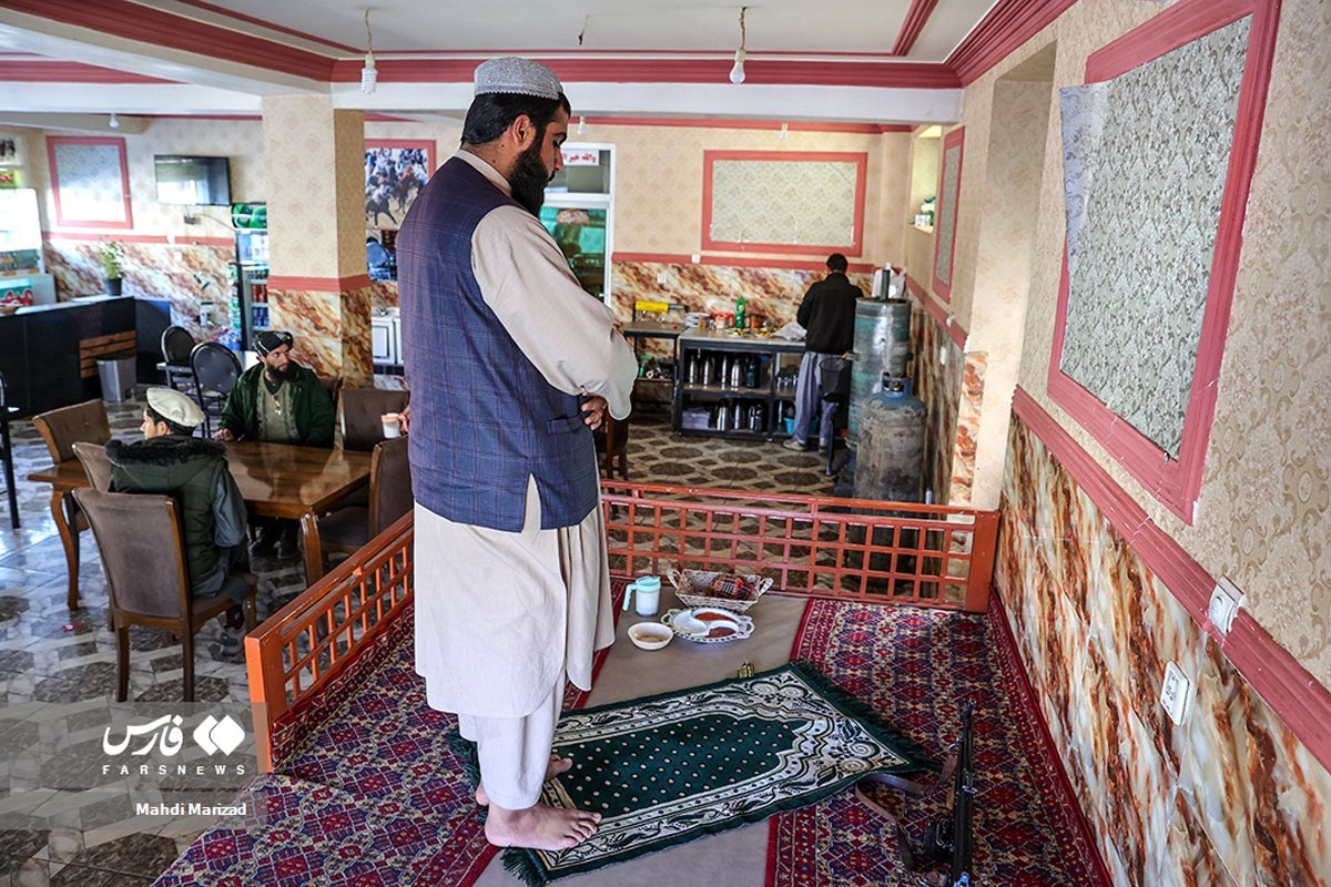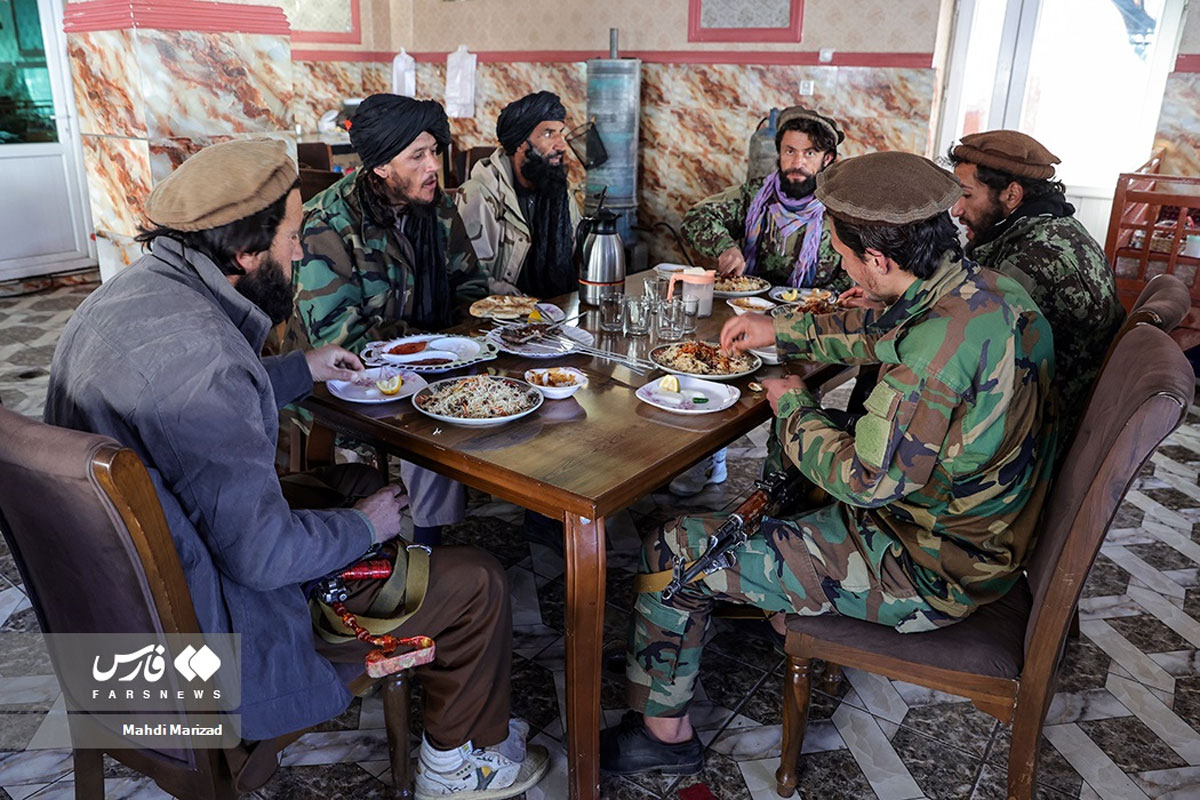 چندتن از اعضای طالبان در حال غذا خوردن در رستورانی در پنجشیر