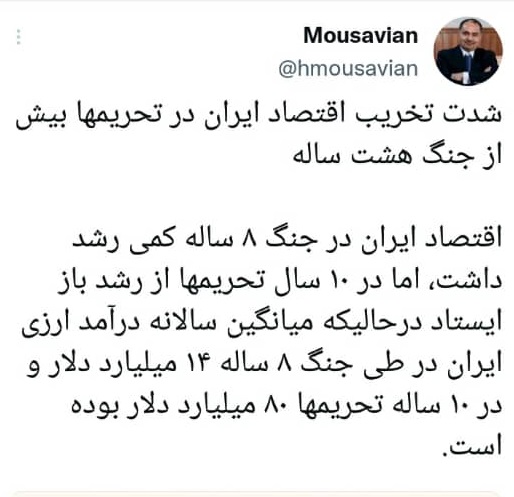 حسین موسویان، دیپلمات سابق نسبت به شدت تخریب اقتصاد ایران در دوران تحریمها هشدار داد.