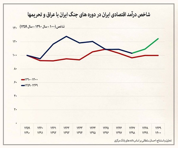 اقتصاد ایران در جنگ ۸ ساله کمی رشد داشت، اما در ۱۰ سال تحریمها از رشد باز ایستاد درحالیکه میانگین سالانه درآمد ارزی ایران در طی جنگ ۸ ساله ۱۴ میلیارد دلار و در ۱۰ ساله تحریمها ۸۰ میلیارد دلار بوده است.