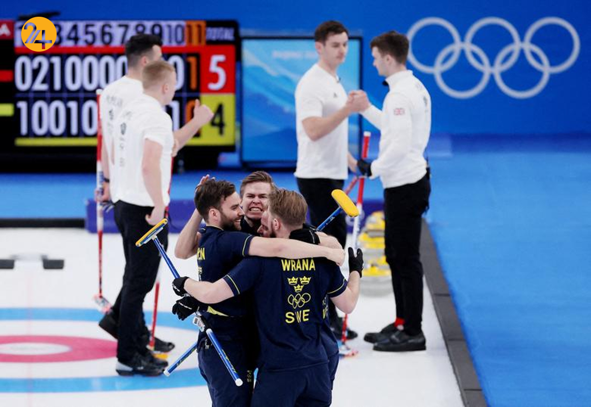 نیکلاس ادین، معاون اسکار اریکسون، راسموس ورانا و کریستوفر ساندگرن پس از پیروزی در مسابقه مقابل بریتانیا در بازی کرلینگ مردان، برنده مدال طلا شدند. واکنش نشان دادند.
