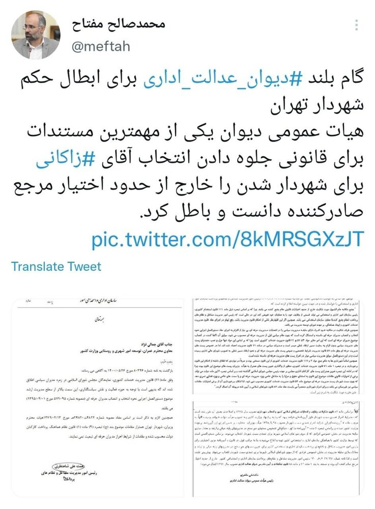 سیاسی » برگزیده کد خبر: ۲۹۹۳۱۹ تاریخ انتشار: ۱۶:۲۳ - ۰۳ اسفند ۱۴۰۰ زاکانی طبق قانون باید از شهرداری تهران برکنار شود + سند محمد صالح مفتاح در توییتی با انتشار سندی از غیرقانونی بودن حکم شهرداری زاکانی نوشت. خبر های مرتبط یازده نکته از مجلس یازدهم ؛ پر استعفا و بی استیضاح واکنش زاکانی به حک کردن نامش بر روی سنگ قبر +فیلم واکنش اصولگرایان به افشای فایل صوتی گفتگوی فرماندهان سپاه چه بود؟ خبر های مرتبط یازده نکته از مجلس یازدهم ؛ پر استعفا و بی استیضاح واکنش زاکانی به حک کردن نامش بر روی سنگ قبر +فیلم واکنش اصولگرایان به افشای فایل صوتی گفتگوی فرماندهان سپاه چه بود؟