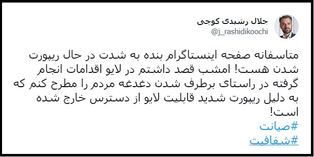 جلال رشیدی کوچی نماینده مجلس با انتشار توئیتی اظهار داشت: میخواستم درباره طرح صیانت بگویم، اینستاگرامم را ریپورت کردند.