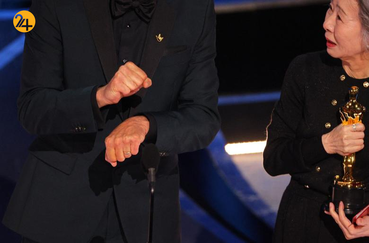 تروی کوتسور در حالی که اسکار بهترین بازیگر نقش مکمل مرد را در «CODA» از مجری یوه جونگ یون دریافت می کند