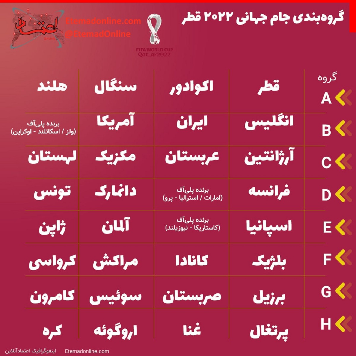 رویداد۲۴ مراسم قرعهکشی مسابقات فوتبال جام جهانی ۲۰۲۲ قطر از ساعت ۲۰:۳۰ امشب (جمعه - به وقت ایران) در مرکز همایشهای شهر دوحه برگزار شد. گروه بندی مسابقات به شرح زیر است: