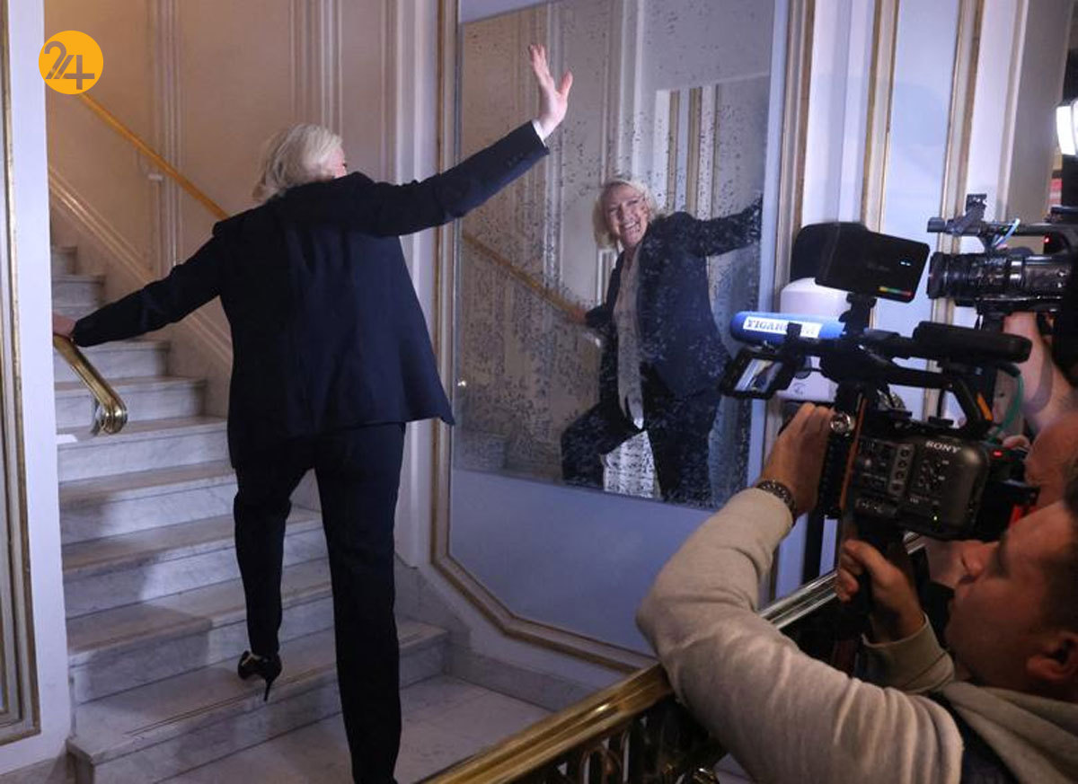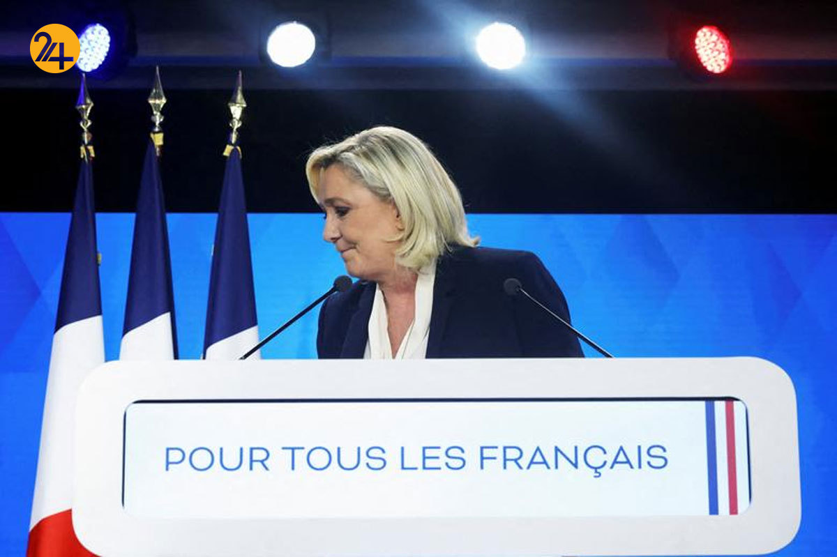 روز ۲۴ آوریل ۲۰۲۲ مارین لوپن از حزب راست افراطی اجتماع ملی پس از شکست مقابل امانوئل مکرون در دور دوم انتخابات ریاست جمهوری فرانسه با چهرهای ناراحت صحنه را ترک میکند