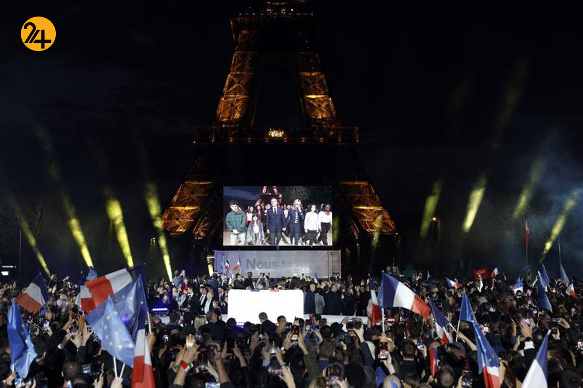 روز ۲۴ آوریل ۲۰۲۲ شادی طرفداران مکرون پس از اعلام نتایج دور دوم انتخابات ریاست جمهوری فرانسه در کنار برج ایفل پاریس