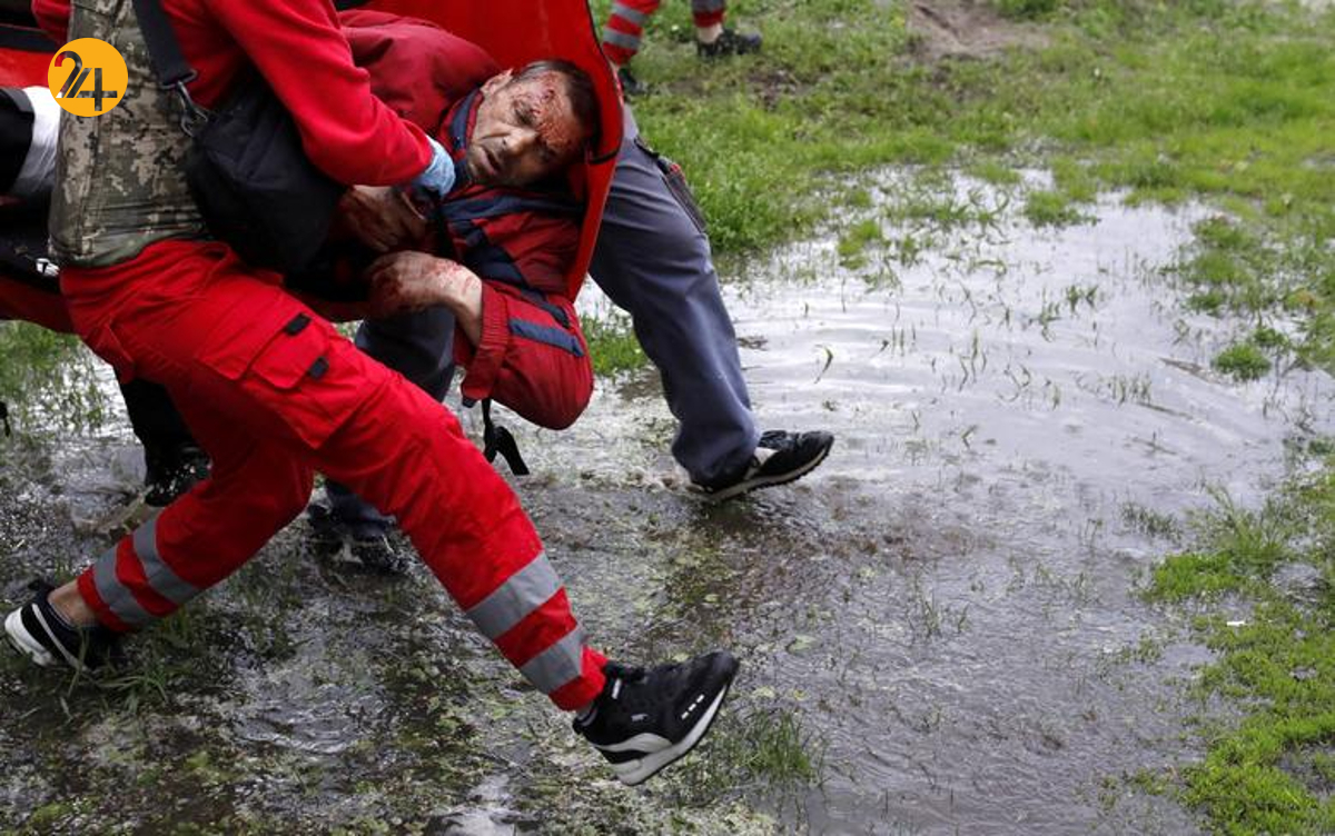 نجات یک شهروند مجروح اوکراینی توسط نیروهای اورژانس بیمارستانی در کی یف پس از حمله مرگبار نیروهای روس