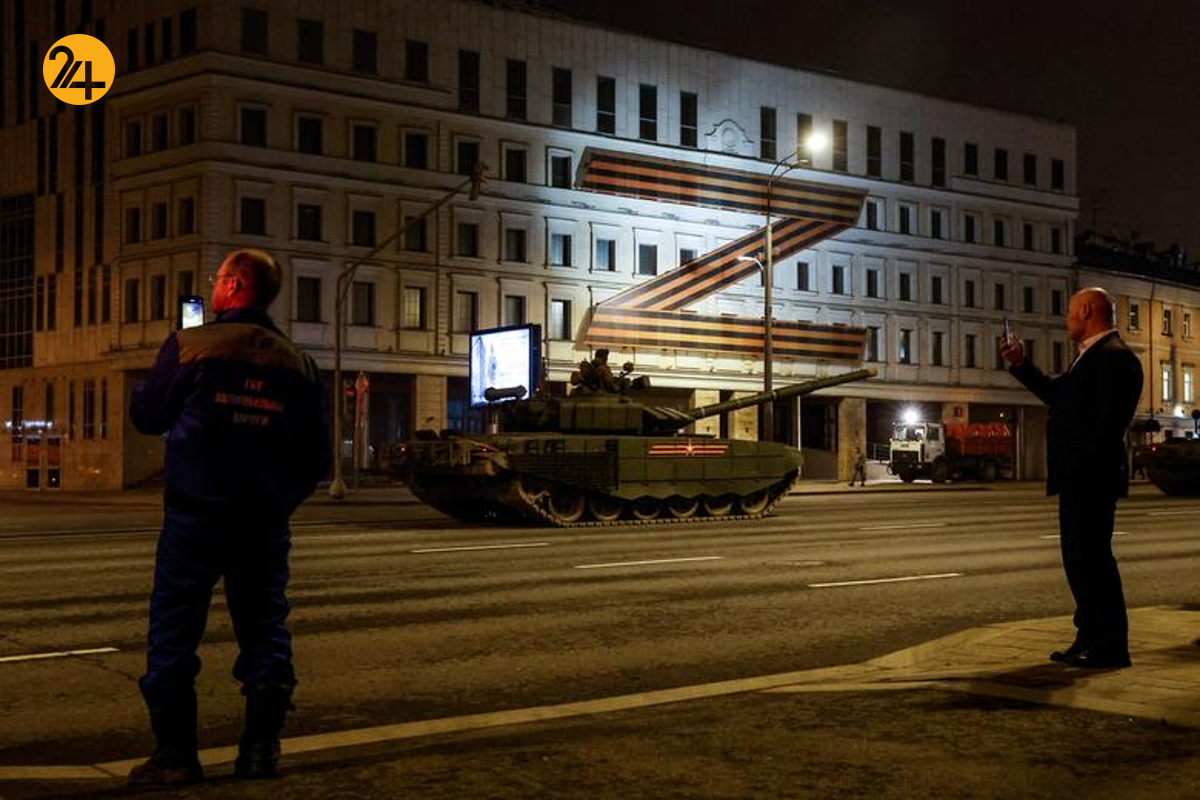 روز ۲۱ آوریل ۲۰۲۲ مردم در حال عکس گرفتن از تانک هایی که از مقابل ساختمان Z در مسکو عبور می کنند. این در حالیست که برای برگزاری رژه روز پیروزی، به مناسبت هفتاد و هفتمین سالگرد پیروزی بر آلمان نازی در جنگ جهانی دوم، در مسکو، روسیه نقل مکان می کنند.