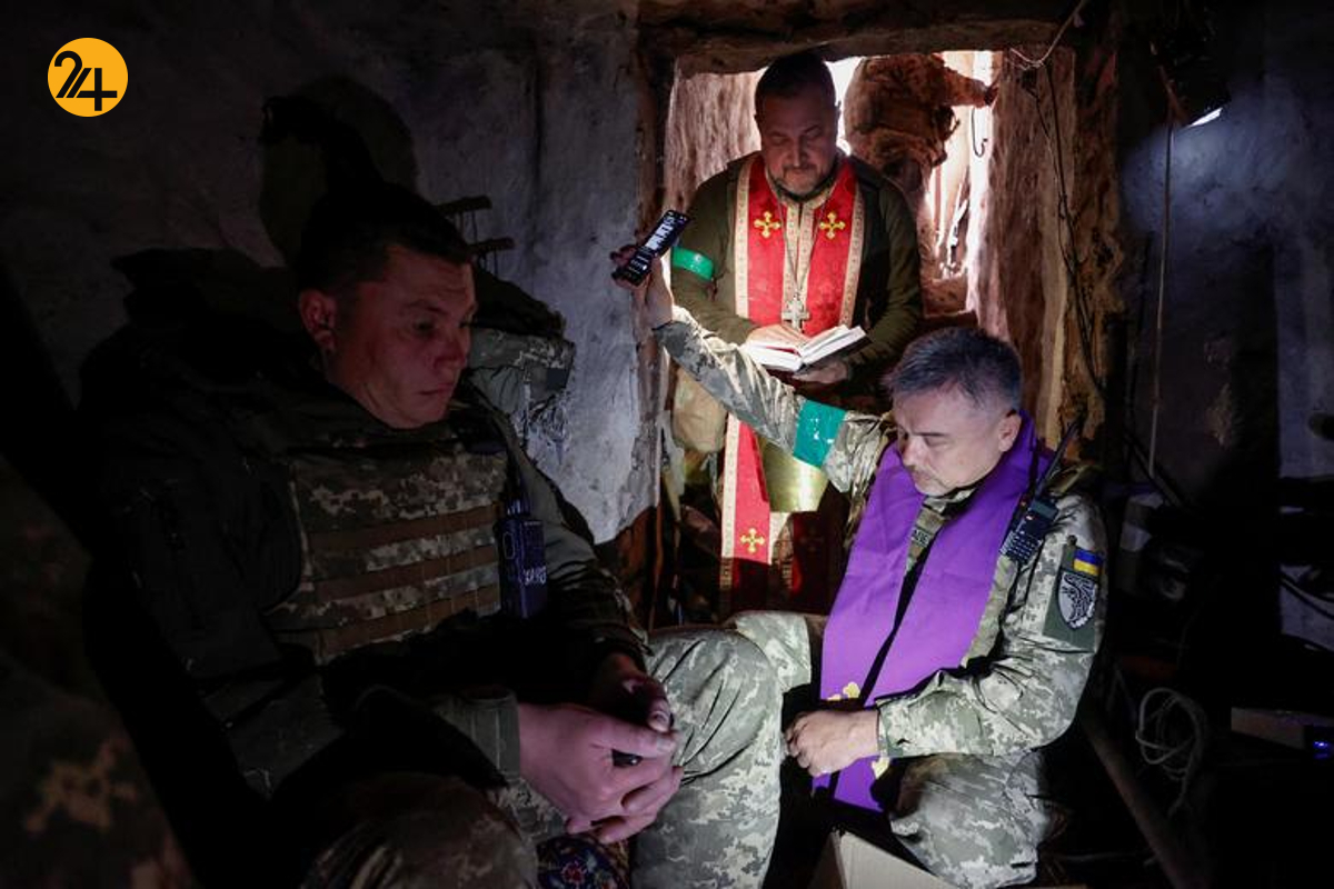 روز ۲۴ آوریل ۲۰۲۲ روحانیون نظامی مراسم عید پاک ارتدکس را برای سربازان اوکراینی در موقعیت خود در منطقه خارکف، اوکراین برگزار می کنند.