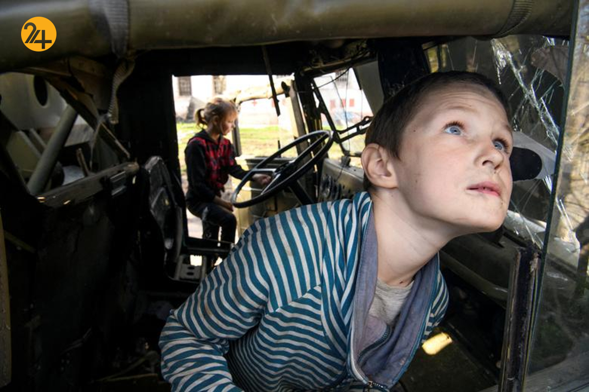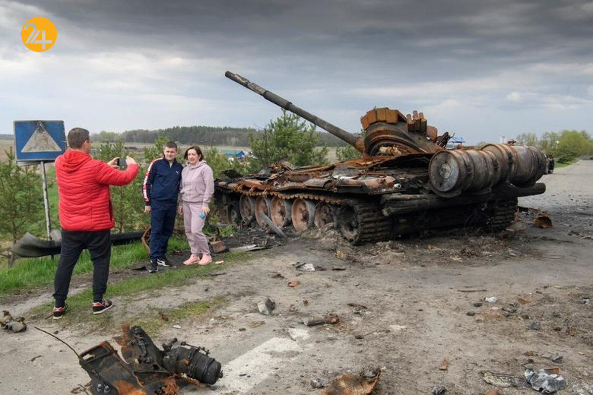 شهروندان اوکراینی در ۲۵ آوریل در مقابل ماشین آلات سوخته نظامی روسیه در روستایی در منطقه کیف عکس می گیرند.