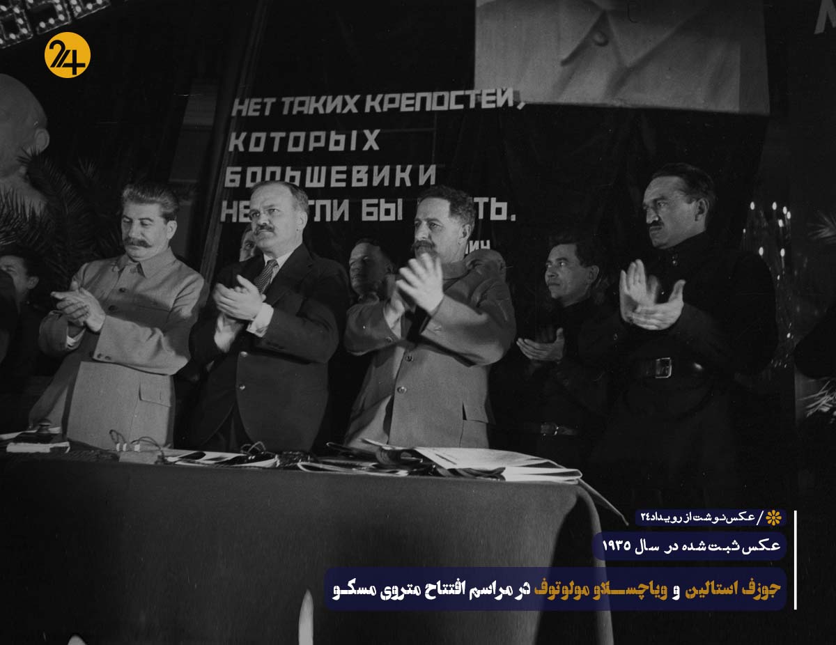 رویداد۲۴ علیرضا نجفی: تصویر ثبت شده در سال ۱۹۳۵ که جوزف استالین رهبر روسیه و ویاچسلاو مولوتوف (عضو کمیته مرکزی حزب کمونیست روسیه که بعدا وزیر امور خارجه اتحاد جماهیر شوروی شد) در مراسم افتتاح متروی مسکو حضور دارند.