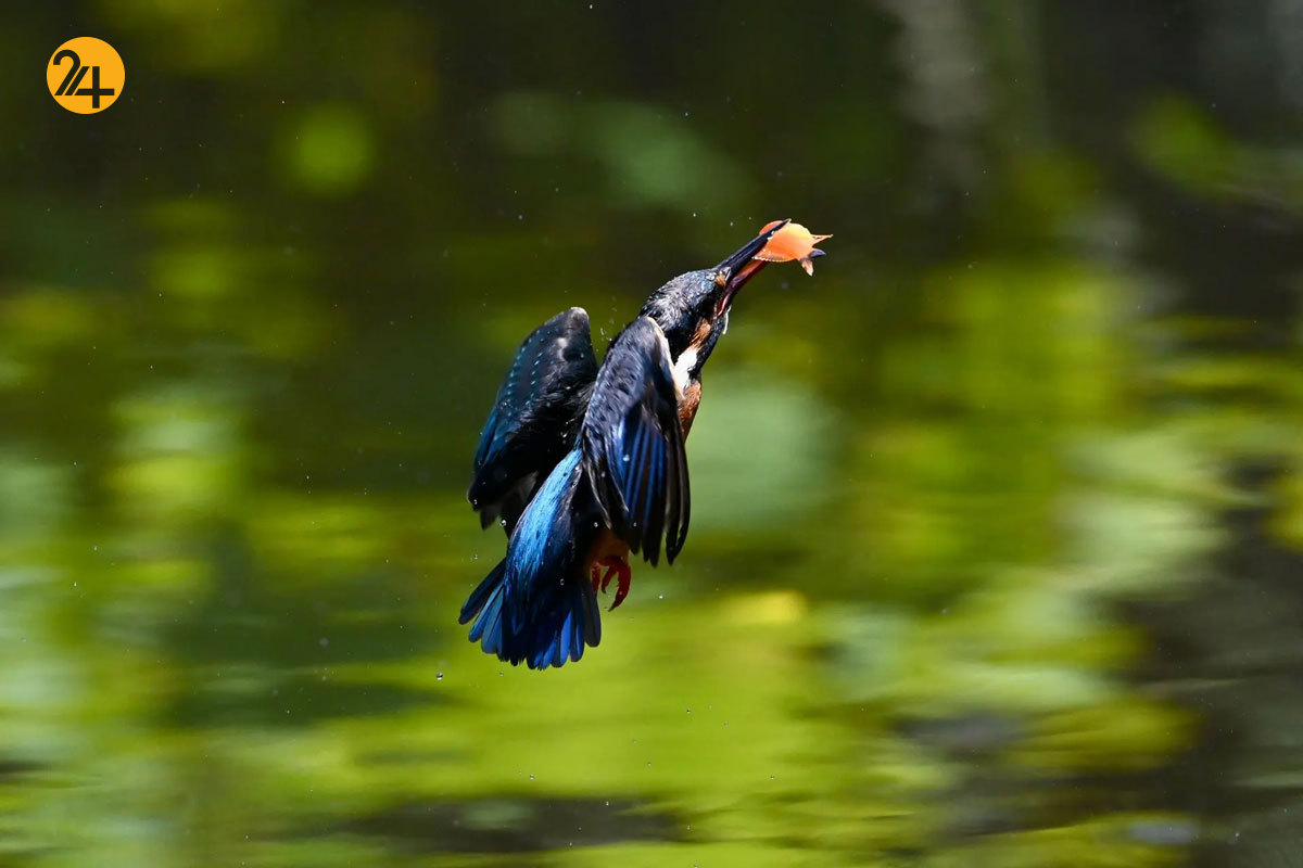 مرغ ماهی‌خوار در حالیکه یک ماهی کوچولو را در منطقه‌ای در شمال تایوان شکار کرده است.