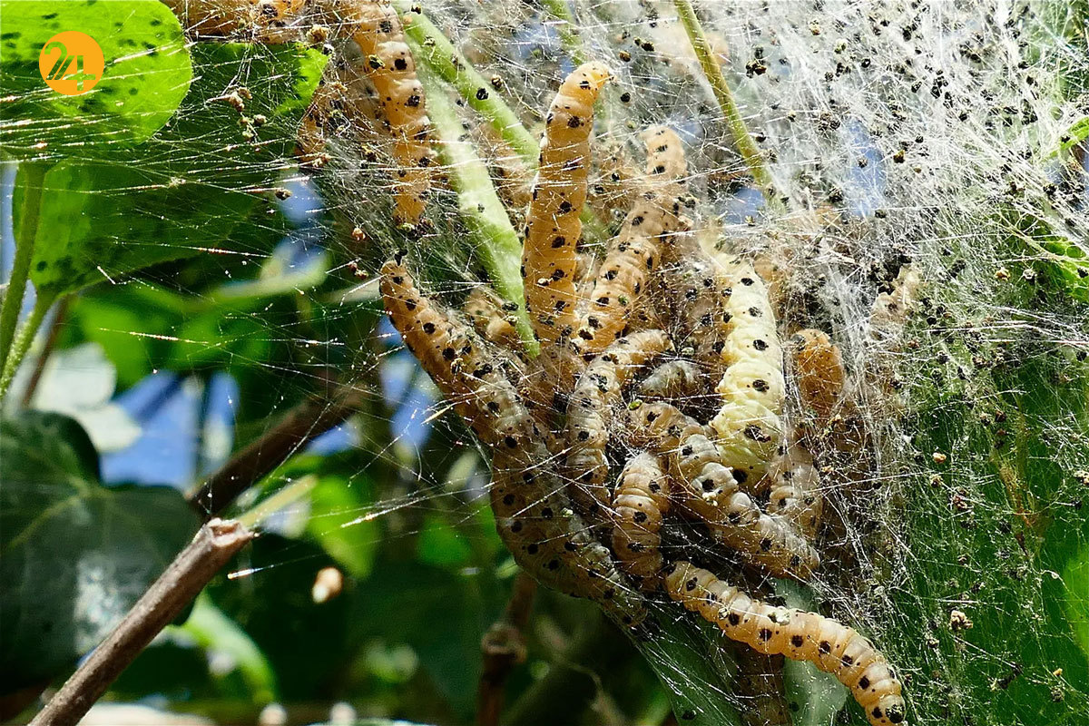 کرم پیله ساز بر درخت بلوطی در شهر هنلی آن تیمز در انگلستان