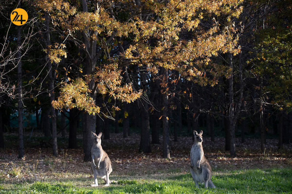 دو کانگرو در چمن‌های وستون پارک در شهر کانبرای انگلستان