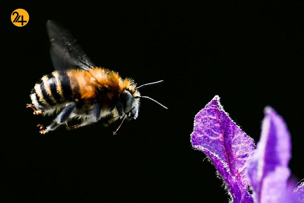زنبوری در حال نشستن بر روی یک گل سنبل برای گرده‌افشانی در شهر برلین آلمان