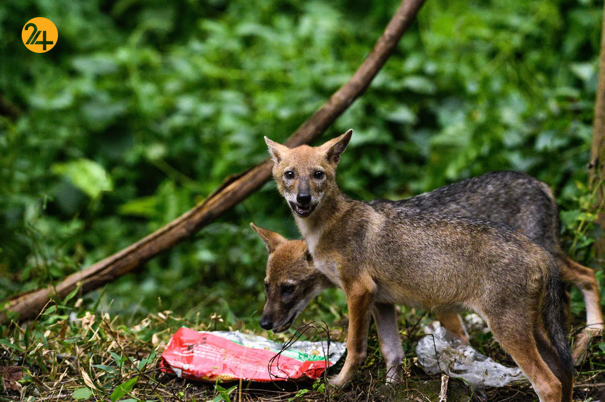 دو شغال در جنگلی در هند در حال یافتن غذا از یک محتوای پلاستیکی