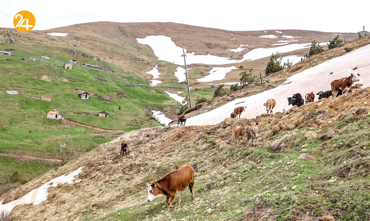 چریدن گاوها در رود یخ‌زده‌ای در ترکیه