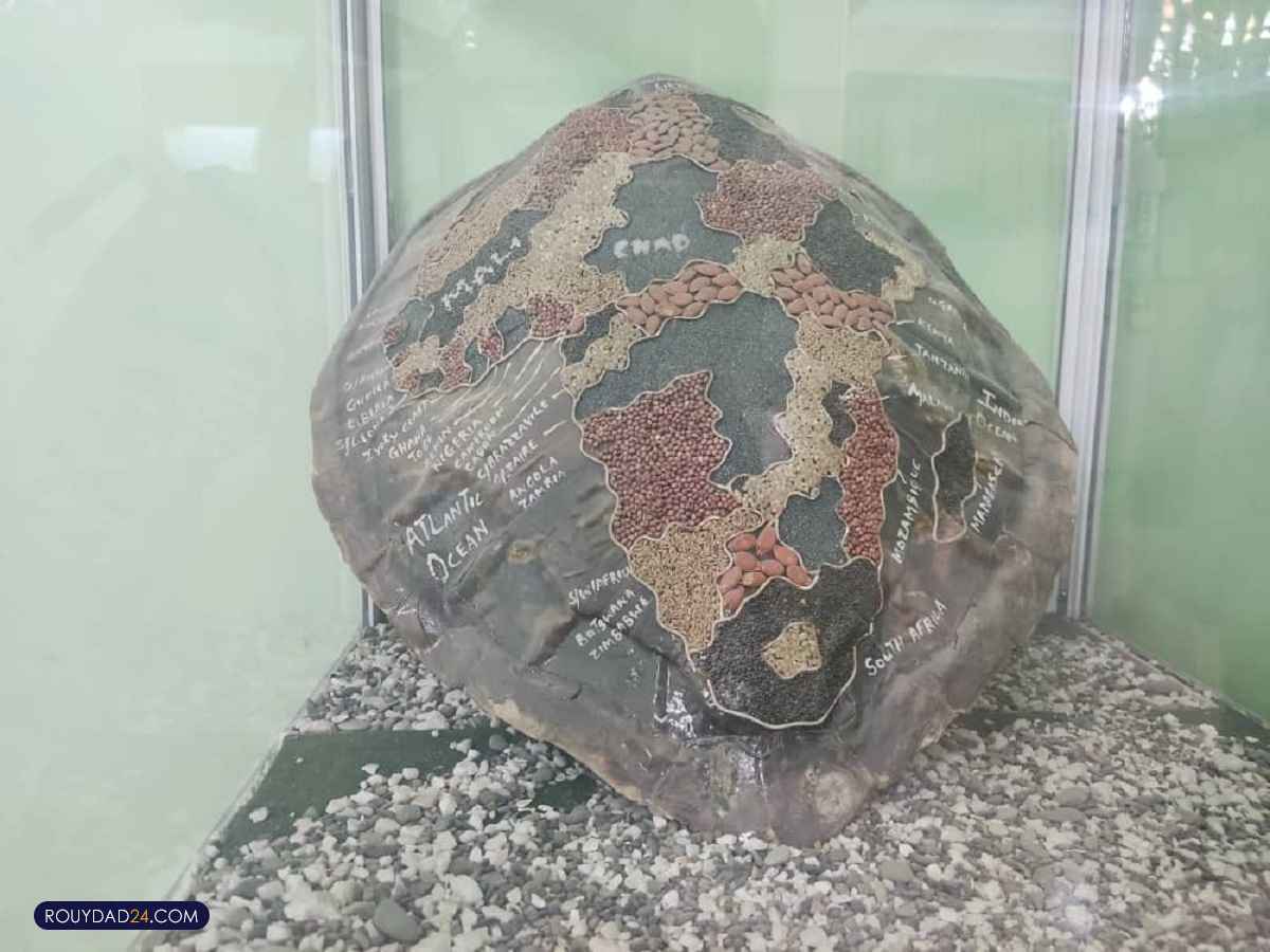 لاک لاک پشت دریایی( آفریقا) این لاک متعلق به لاک پشت دریایی است که بومیان سریالئون آن را با دانه های رنگی مختلف به شکل نقشه قاره آفریقا تزئیین کرده اند.