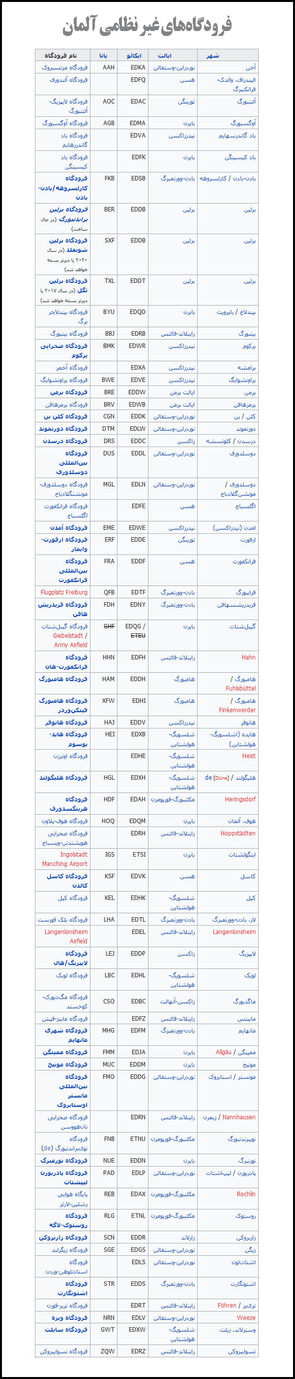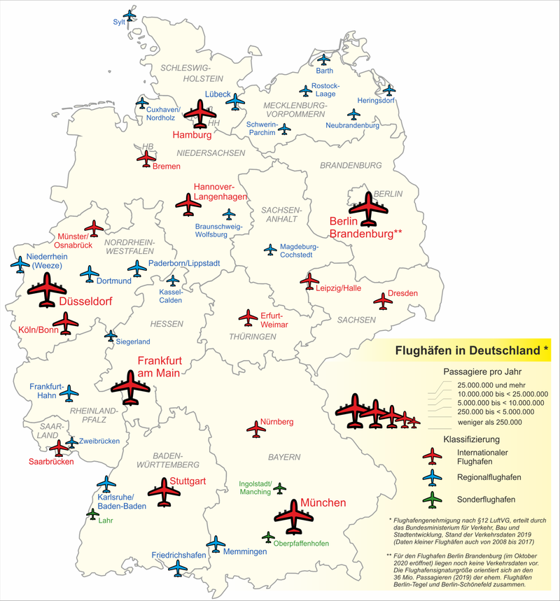 در مجموع فقط ۳۶ فرودگاه بینالمللی در آلمان وجود دارند! از فرودگاههای کوچک با مساحت باند کمتر گرفته تا فرودگاههای عظیمی همچون فرانکفورت و مونیخ که دهها میلیون مسافر را سالانه جابهجا میکنند. این فرودگاهها تا ۱۰۰ خط هواپیمایی مختلف را دارا هستند که به مسافران داخلی و خارجی خدمت رسانی میکنند.