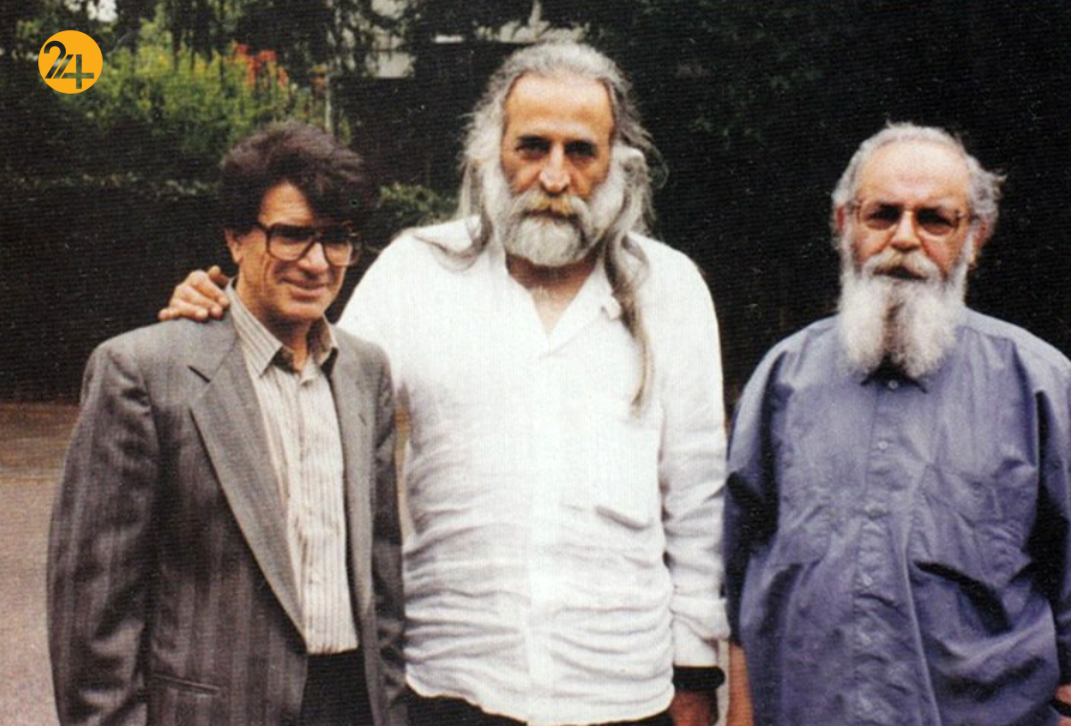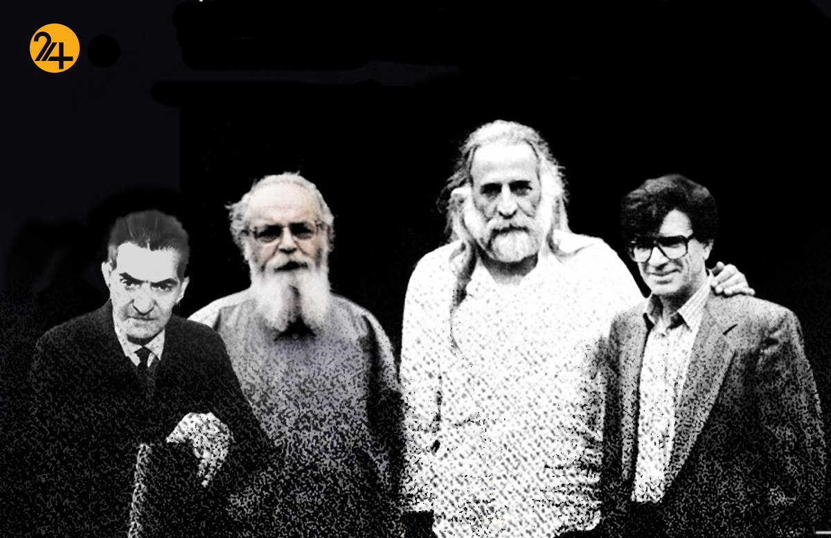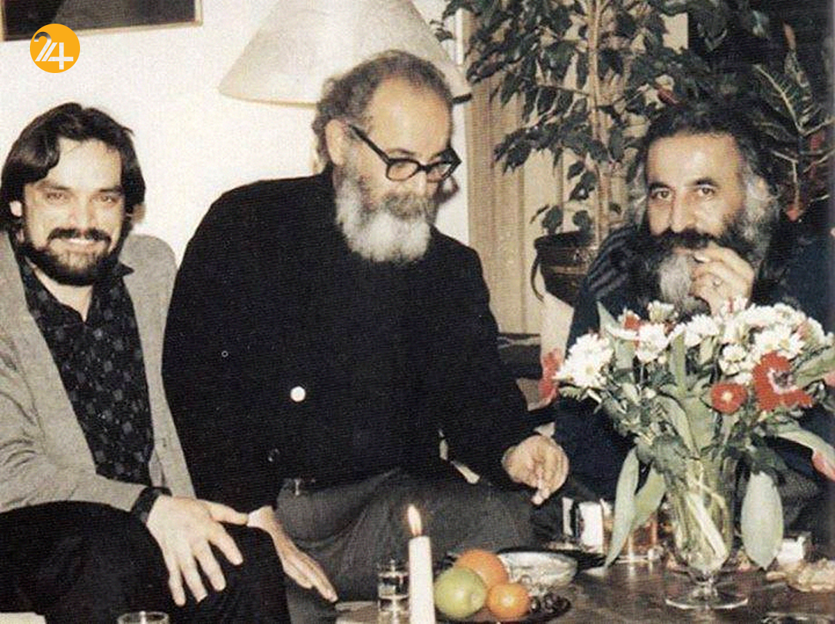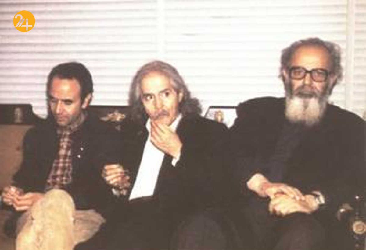 از راست محمدرضا شجریان خواننده ایرانی محمدرضا لطفی موسیقی دان هوشنگ ابتهاج و شهریار شاعران بزرگ ادبیات ایران