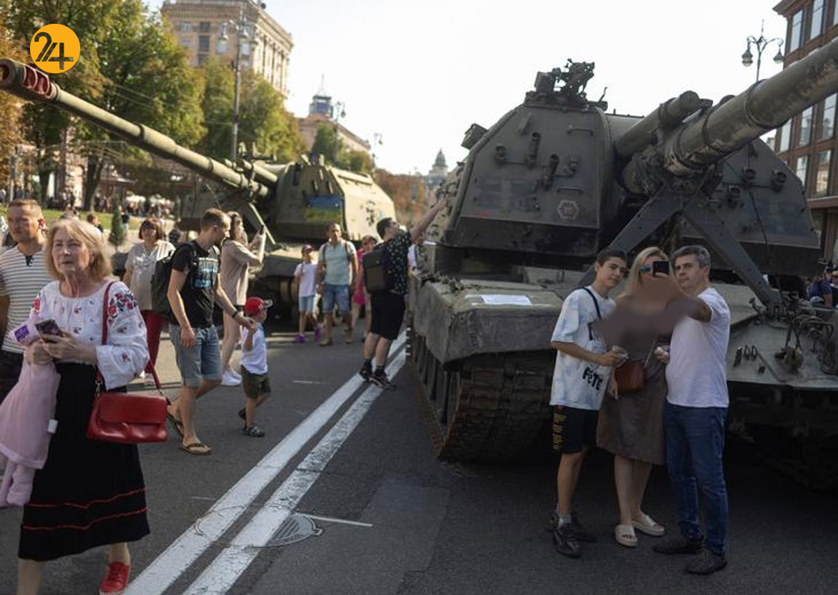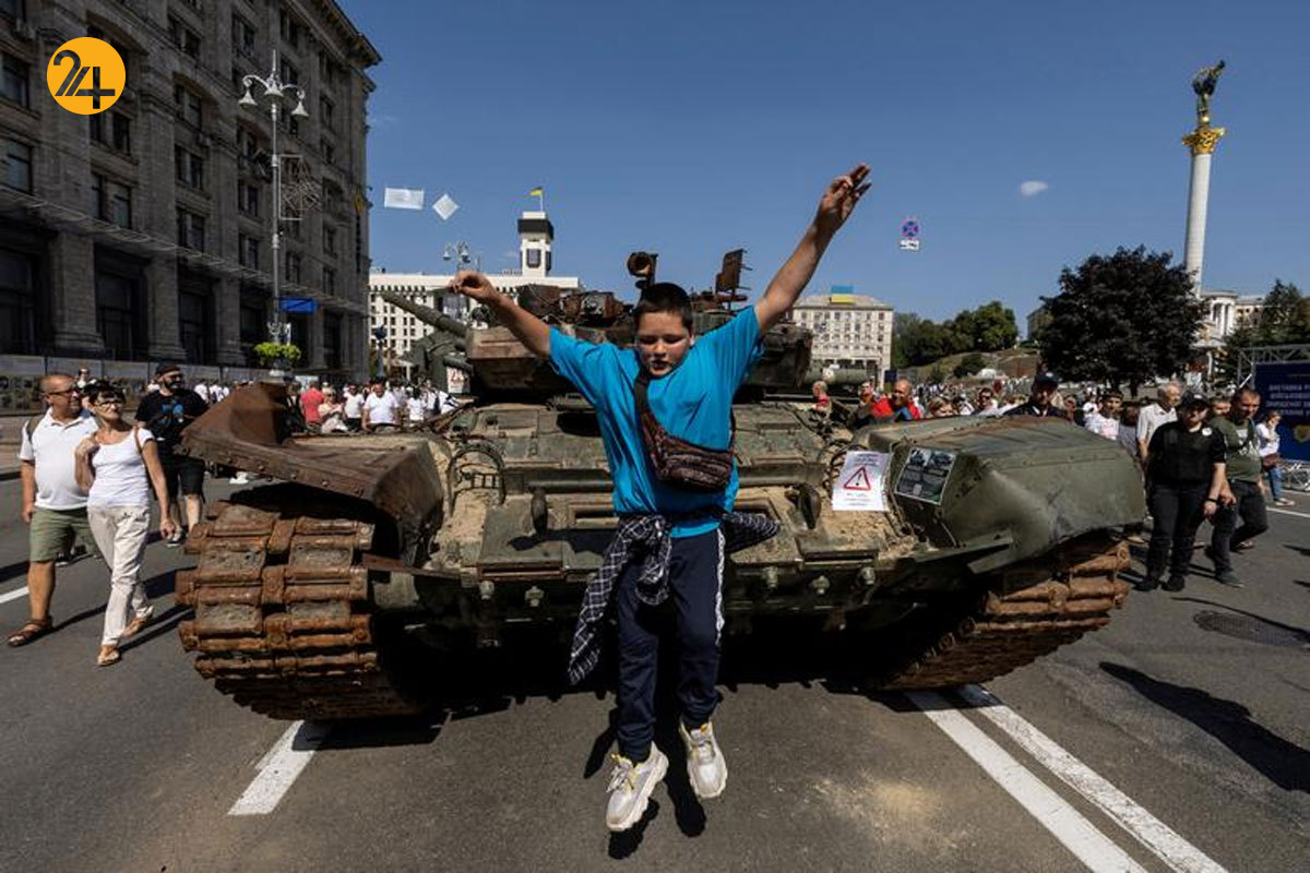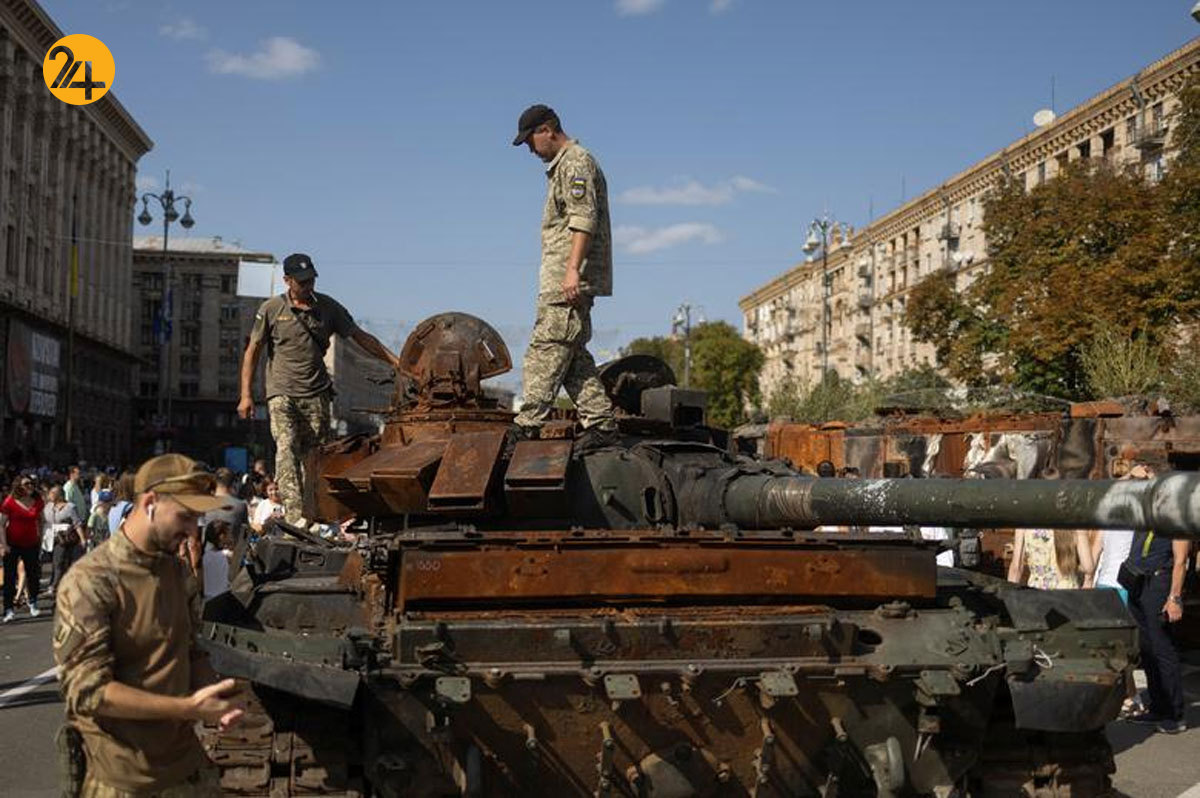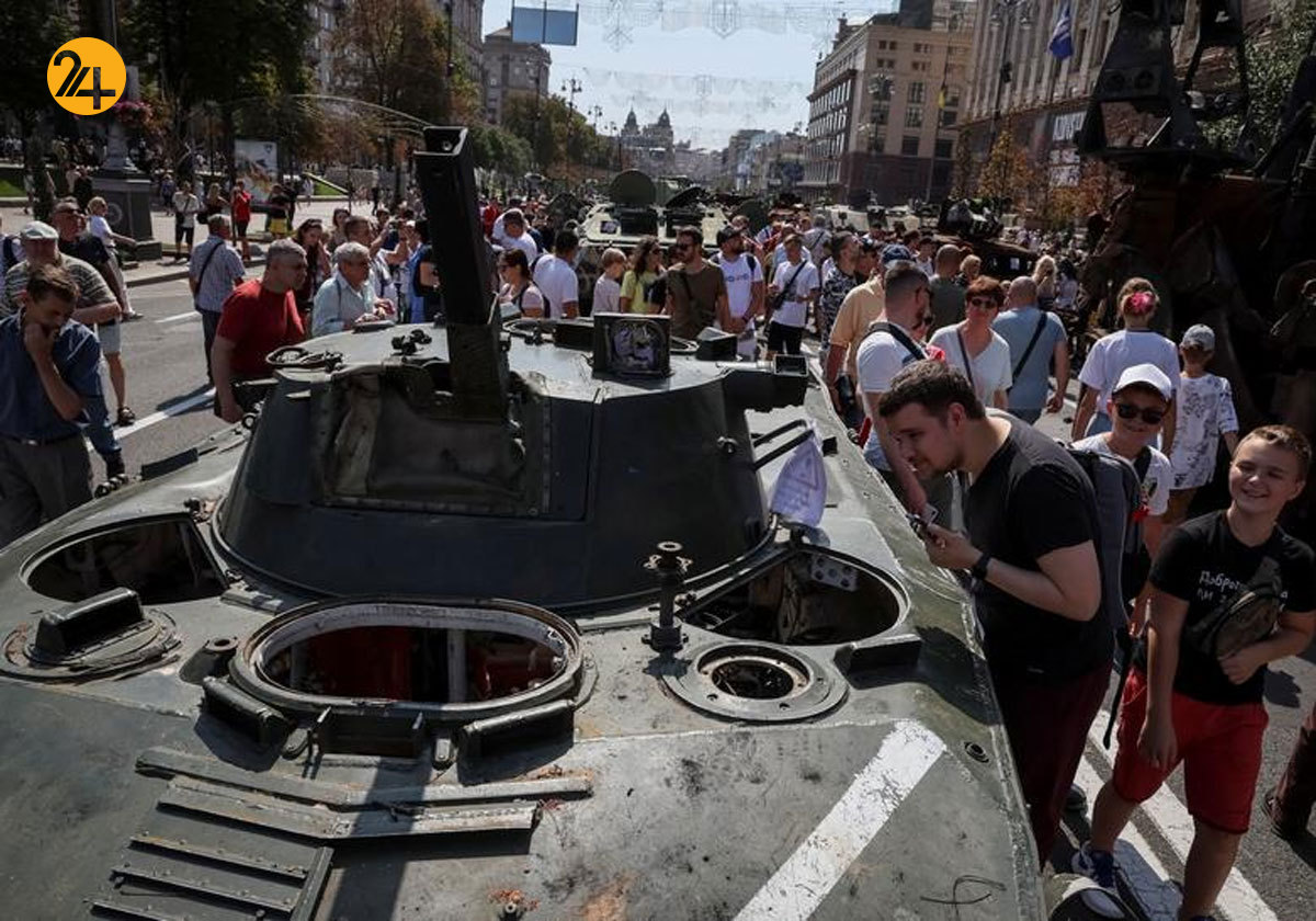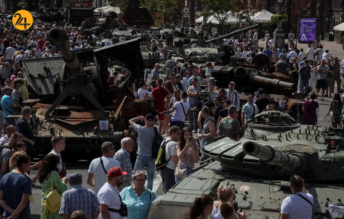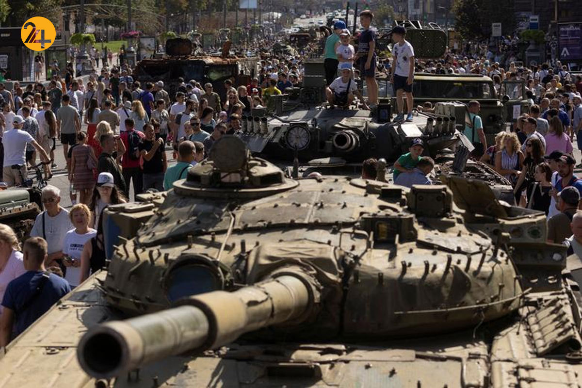 در حالیکه تنش میان روسیه و اوکراین افزایش یافته صدها سرباز اوکراینی برای نشان دادن توان نظامی خود تانکهای سوخته روسیه که در جنگ با اوکراین در خاک این کشور منهدم شده بود را در میدان استقلال کییف به نمایش گذاشتند.
