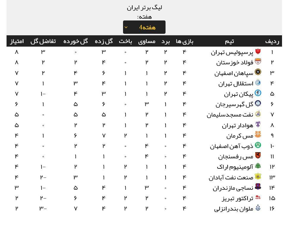 جدول رده بندی لیگ برتر در پایان هفته چهارم