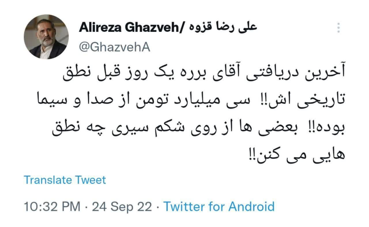 علیرضا قزوه نوشت: «آخرین دریافتی آقای برره یک روز قبل نطق تاریخیاش، سی میلیارد تومان از صدا و سیما بوده؛ بعضیها از روی شکم سیری چه نطقهایی میکنند.»