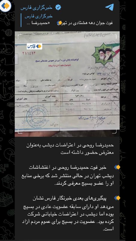 خبرگزاری فارس البته لحظاتی بعد خبر خود را اصلاح کرد و نوشت حمیدرضا روحی بسیجی نبوده و از معترضان بوده است.
