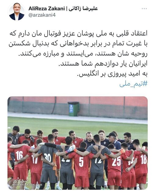 «اعتقاد قلبی به ملی پوشان عزیز فوتبالمان دارم که با غیرت تمام در برابر بدخواهانی که به دنبال شکستن روحیه شان هستند، میایستند و مبارزه میکنند. ایرانیان یار دوازدهم شما هستند. به امید پیروزی بر انگلیس.»