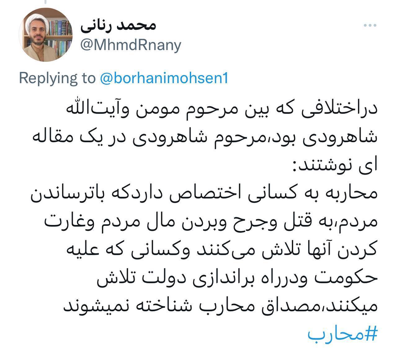 رویداد۲۴ محمد رنانی نوشت: در اختلافی که بین مرحوم آیتالله مومن و آیتالله شاهرودی بود، مرحوم شاهرودی در یک مقاله ای نوشتند: محاربه به کسانی اختصاص دارد که با ترساندن مردم، به قتل و جرح و بردن مال مردم و غارت کردن آنها تلاش میکنند و کسانی که علیه حکومت و در راه براندازی دولت تلاش میکنند، مصداق محارب شناخته نمیشوند.