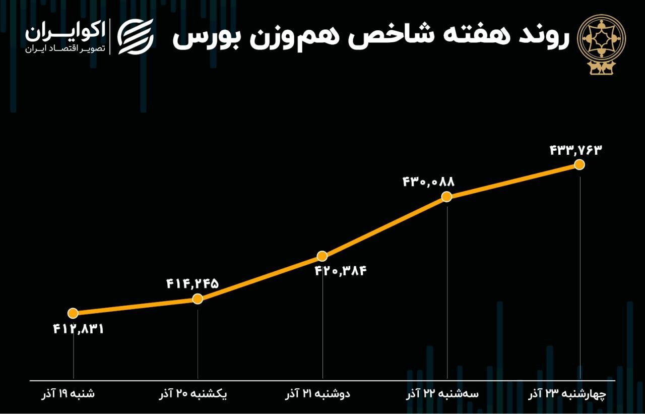 رویداد۲۴ به گزارش اقتصادنیوز به نقل از اکوایران، این هفته، شاخص کل بورس تهران در ۴ روز پیاپی رشد قابل توجهی را پشت سر گذاشت. در اولین روز کاری هفته، شاخص ۱۹ هزار واحد افت کرد و به کانال ۱.۳ میلیونی سقوط کرد. اما روز یکشنبه ۵ هزار و ۶۲۳ واحد بالا آمد و روز دوشنبه با صعود ۲۰ هزار واحدی به کانال یک میلیون و ۴۰۰ هزار واحد بازگشت. شاخص روز سه‌شنبه جهش ۴۵ هزار واحدی را پشت سر گذاشت و روز چهارشنبه، در آخرین روز معاملاتی هفته، ۱۸ هزار و ۲۹۱ واحد رشد کرد.