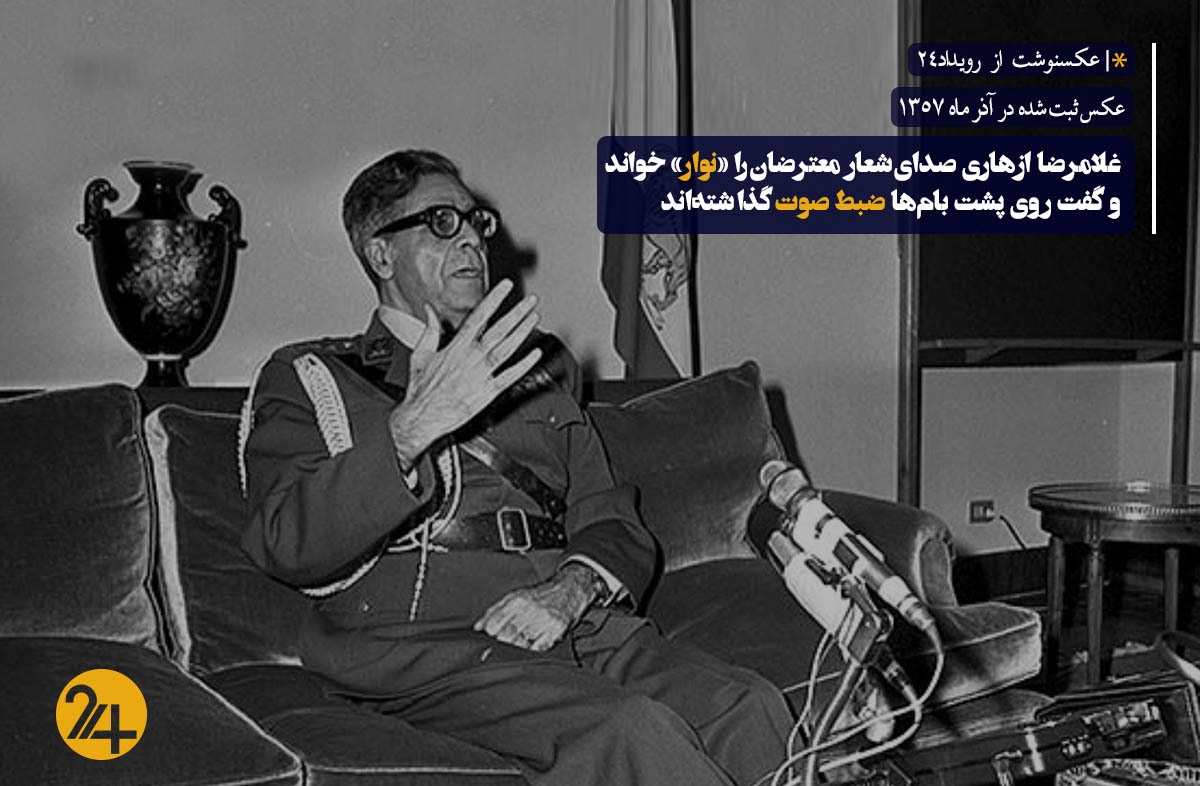 رویداد۲۴ علیرضا نجفی: تصویر ثبت شده در آذر ماه ۱۳۵۷ که غلامرضا ازهاری در یک مصاحبه تلویزیونی گفته بود معترضان و انقلابیونی که در خیابانها هستند، واقعی نیستند و روی پشت بامها ضبط صوت میگذارند تا تعدادشان زیاد به نظر برسد. این سخنان توسط ازهاری در مجلس سنا نیز مطرح شده بود.