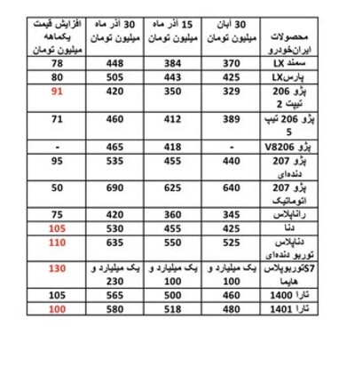 مقایسه قیمت خودروهای پرتیراژ در فاصله یک ماهه ۳۰ آبان تا ۳۰ آذر به شرح زیر است: