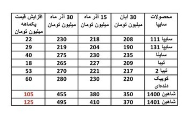 در محصولات سایپا نیز شیب افزایش قیمتها به همین صورت است؛ بهگونهای که کمترین افزایش قیمت مختص تیبا است که ۱۸ میلیون تومان بوده و بیشترین افزایش قیمت متعلق به شاهین با ۱۲۵ میلیون تومان است.