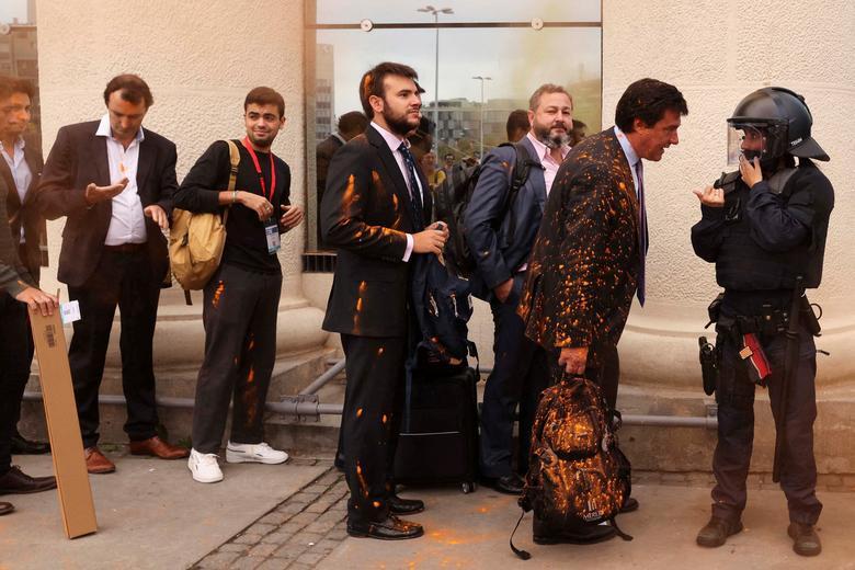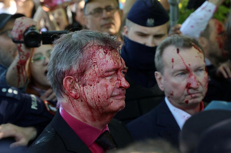 پرتاب گوجه فرنگی به صورت سرگئی آندریف سفیر روسیه در لهستان هفتاد و هفتمین سالگرد پیروزی بر آلمان نازی در ورشو